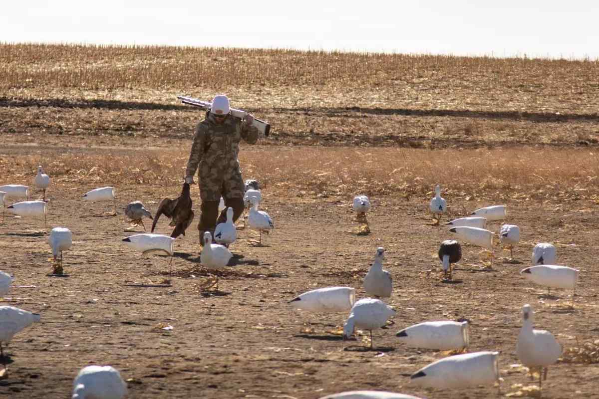 Motion is key Motion in the spread can be a make-or-break element to having a successful hunt. (Photo courtesy of Ryan Barnes.) “Snows are running in bigger numbers,” said Washington outfitter and call-maker, Bill Saunders. “And that’s what they’re looking for. They’re looking for that mass of birds on the ground. They’re way more vocal on the ground than Canadas, and that’s why the E-caller (electronic caller) can be such a big help.” He continued, “Movement is vital. Three ‘dead’ decoys is one thing; 3,000 decoys that aren’t moving is another, so you need motion in that spread. Whether it’s wind or a flag or pull string this or pull string that to bring the spread alive.” Saunders does this by way of Super-Secret “pull string rotary machines” made out of old bicycle sprockets, wind-activated fliers, pull string fliers, and traditional flags.